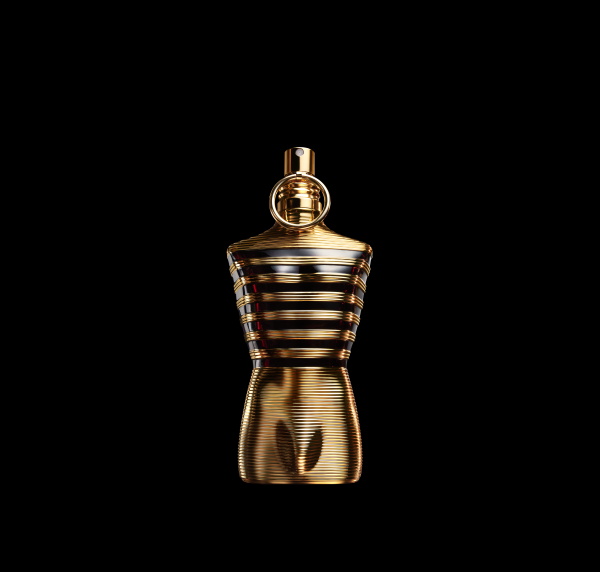 Son Flacon... Le feu sous la classe...Monsieur Gaultier ne pouvait qu'imaginer un écrin à sa taille, réinventant sa boite métallique iconique : plaquée à son nom, striée à l'or fin et rayée d'ambre chic.