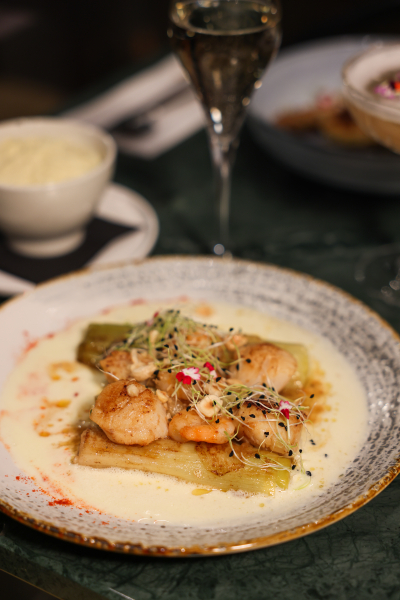 Le dîner se poursuit avec un feuilleté des sous-bois, associant champignons et shiitakés déglacés au Chablis, avant de laisser place à une assiette marine : un duo de Saint-Jacques et crevettes, servi avec une fondue de poireaux crémeuse et une purée de panais.