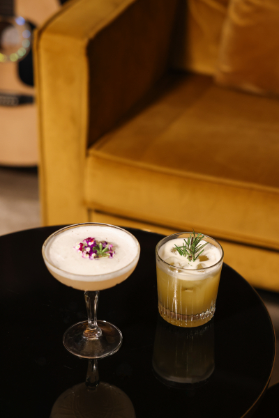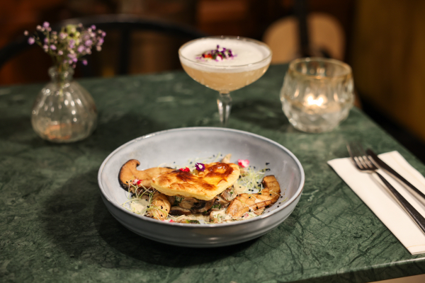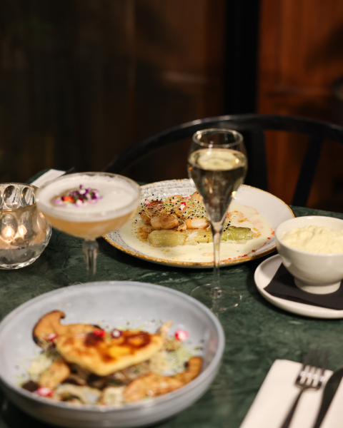 Dès l'entrée, le ton est donné avec un accord tout en fraîcheur et en finesse : blinis au tarama blanc, oeufs de saumon et velouté de butternut relevé d'huile de truffe, accompagnés d'un cocktail au champagne mêlant litchi, yuzu et mûre.